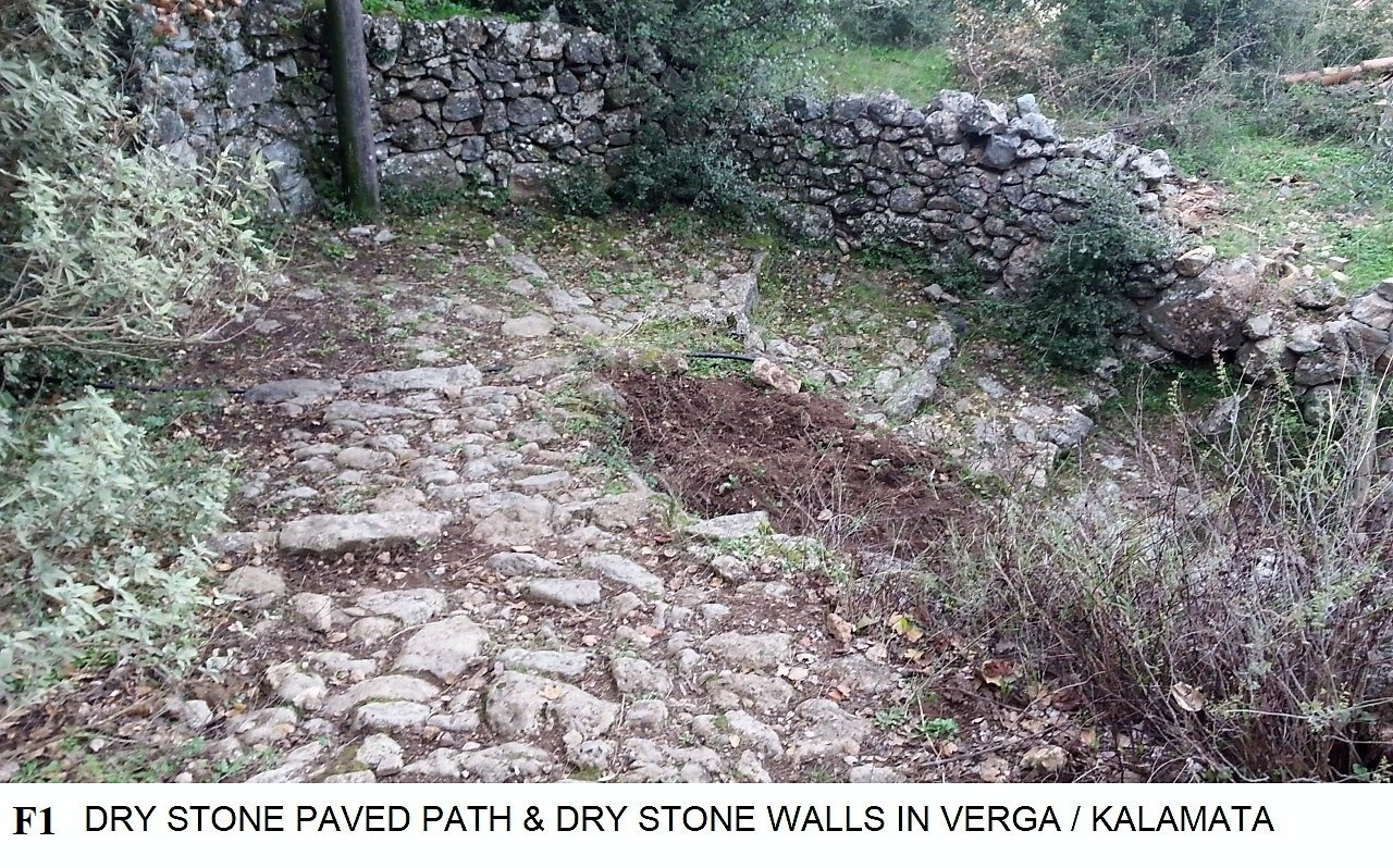 The acknowledgment of the traditional dry stone-paved paths of Verga as monuments of cultural heritage protects these old roads from damages or trespassing, through the provisions of the “archaeological” Law 3028/2002, ensuring their historical – geographical and operational continuity, from the beach of Kalamata up to Agios Georgios on Mount Kalathi (1340 m altitude).