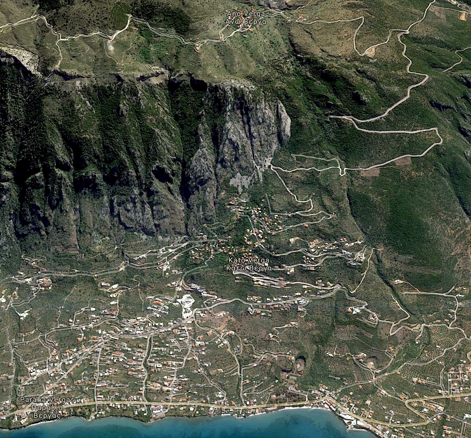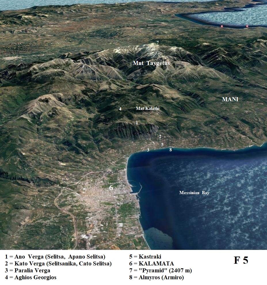 Verga is a village situated the entrance gate to the Messinian or Outer (Exo) Mani, on the western slope of Mount Kalathi – part of the Taygetus Mountain Range. Today, Verga belongs to the Municipality of Kalamata, Messinia and ecclesiastically to the Metropolis of Gytheion, Laconia. The community comprises three settlements: Ano Verga ( formerly Selitsa or Apano Selitsa, average altitude 850 m), Kato Verga (formerly Selitsanika or Cato Selitsa, 300 m) and Paralia Verga (50 m).